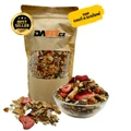 Směs olejnatých semen v různém poměru 35 % (semena slunečnice loupená, semena tykev loupaná, lněná semínka, chia semínka (Salvia Hispanica)), kokosové chipsy, jádra mandlí, čekankový sirup, jahody sušené mrazem, jedlá sůl.