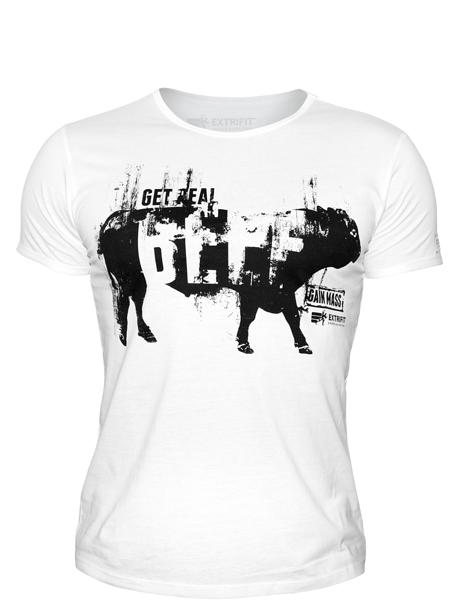 Vyrobeno je z příjemného, vzdušného a pružného materiálu a na přední i zadní straně má potisk. Přední strana - černý potisk s obrazem skotu a nápisem „get real beef“, zadní strana - logo Extrifit v černém provedení a variace nápisu vpředu. Zahrnuté rukávy.