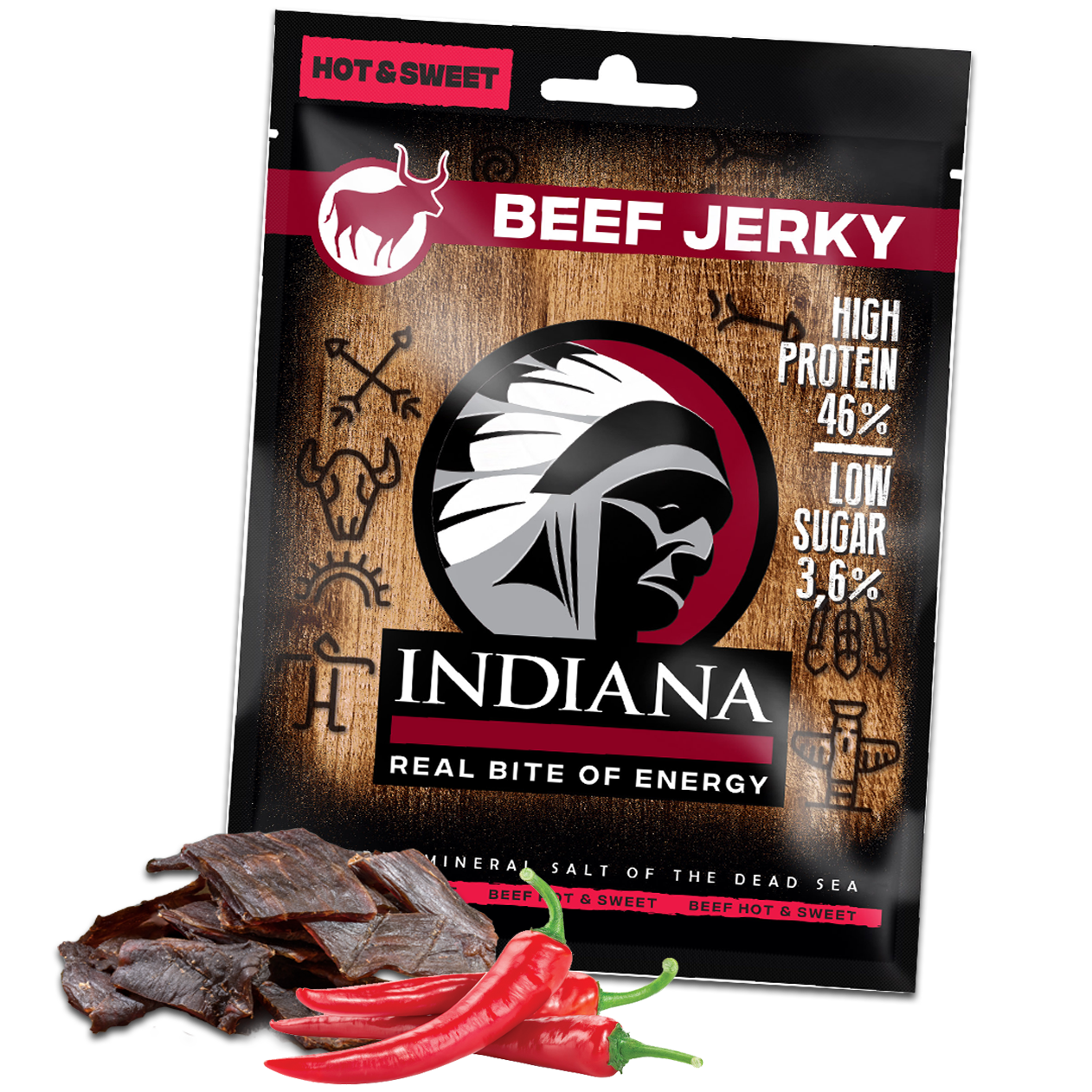 Pochoutka z hovězího sušeného masa. Indiana Beef Jerky sušené maso je plně evropsky certifikovaný produkt vyrobený převážně z evropských surovin s klasickou evropskou slanou příchutí. 100 g sušeného masa odpovídá 240 g syrového masa (300 g syrového masa tuňák), se všemi prospěšnými nutričními hodnotami.