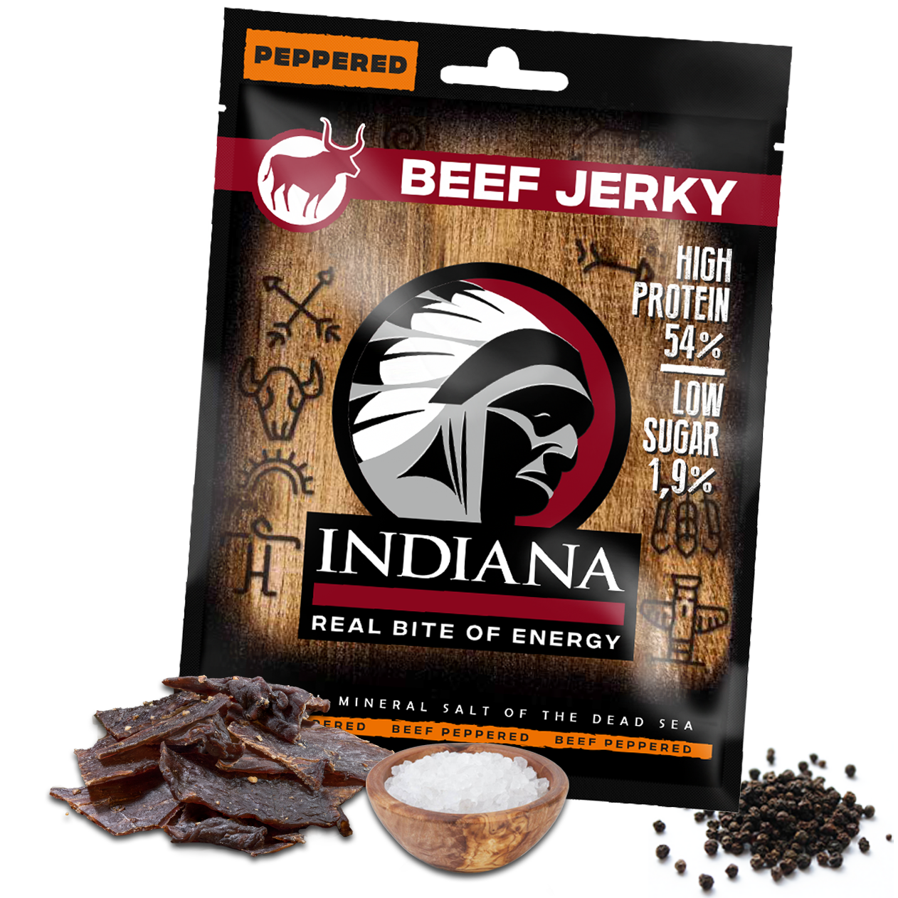 Pochoutka z hovězího sušeného masa. Indiana Beef Jerky sušené maso je plně evropsky certifikovaný produkt vyrobený převážně z evropských surovin s klasickou evropskou slanou příchutí. 100 g sušeného masa odpovídá 240 g syrového masa (300 g syrového masa tuňák), se všemi prospěšnými nutričními hodnotami.